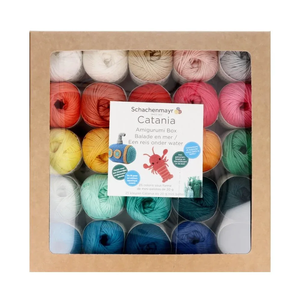 Wordt geleverd per Amigurumi Box bestaande uit 25 minibolletjes Catania à 20 gram in 25 verschillende kleuren, 1 kleurkaart van alle kleuren Catania en 1 patronenboekje Nederlands met de haakpatronen voor alle 12 Journey Underwater-figuurtjes.
