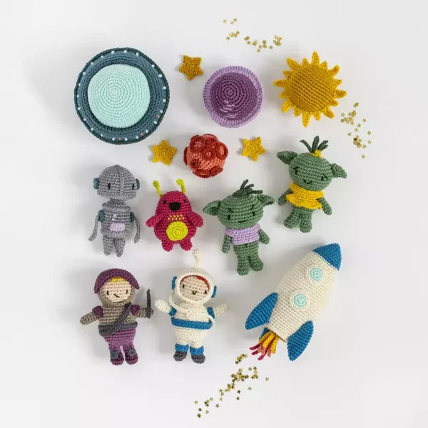 De Catania Amigurumi Box Space Trip bestaat uit 25 minibolletjes Schachenmayr Catania van 20 gram in 22 verschillende kleuren, 1 kleurkaart van alle 100 kleuren Catania en 1 patronenboekje Nederlands met haakpatronen voor 12 verschillende kleine projecten in ruimtesfeer. Zo maakt u bijvoorbeeld sterren, planeten, een ruimteschip, astronauten, vrolijke aliens en zelfs een vliegende schotel. Speciaal voor het haken van de buitenaardse wezens bevat deze box bovendien een limited edition kleur: alien groen. De doos is 21,5 x 21,5cm.
