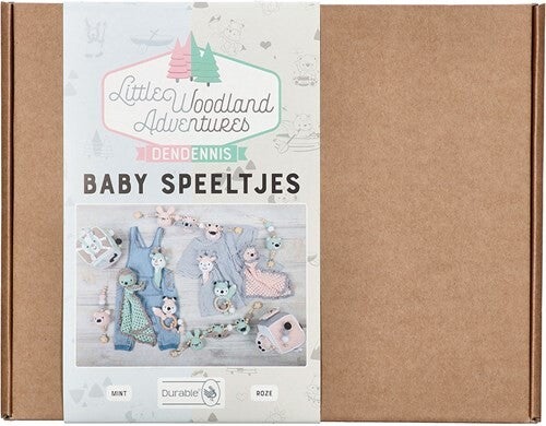 Deze wordt geleverd in een handige doos gevuld met voldoende Durable garen, de benodigde accessoires als houten kralen, piepers, rammelkralen, schuimkubus, knisperfolie en 20gram vulling. Uiteraard bevat het pakket een mooi patronenboekje van alle speeltjes in de Little Woodland Adventures stijl.
